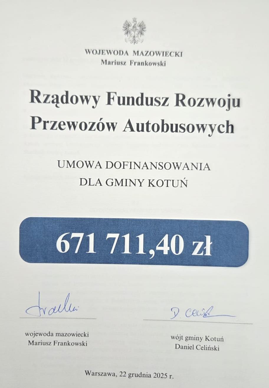 W dniu 22.12.2025 r. Wójt Gminy Kotuń – Daniel Celiński podpisał umowę z Wojewodą Mazowieckim – Mariusz R. Frankowski dotyczącą objęcia dopłatą przewozów autobusowych o charakterze użyteczności publicznej.