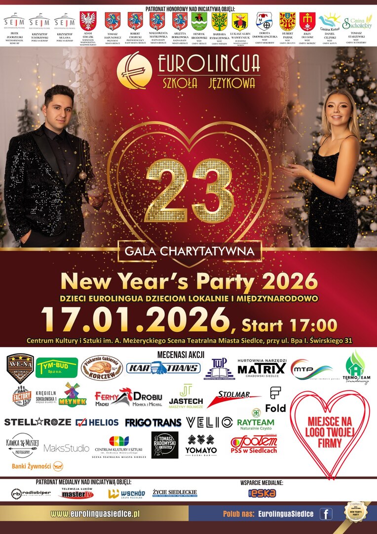 Już 17 stycznia 2026 r. o godz. 17:00 w Centrum Kultury i Sztuki w Siedlcach odbędzie się XXIII Gala charytywna New Years Party 2026